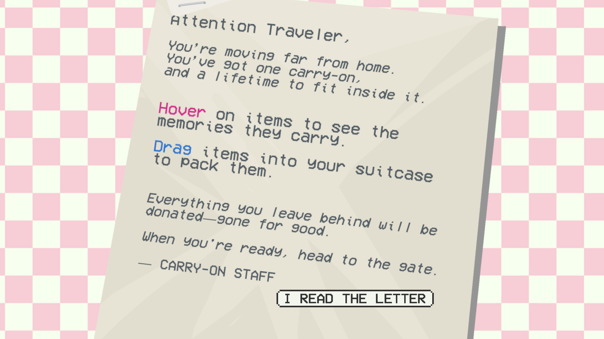Carry-On turns that moment into a gentle puzzle where every trinket you pack preserves a fragment of someone’s life. Every object you consider carries the stories you attach to it.