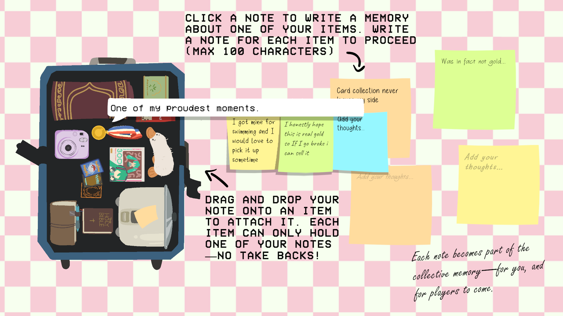 *The game uploads each suitcase to an external archive. You can explore what others have packed and contribute your own story to the collection.